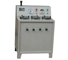 1、在使用前根據(jù)試件的試驗要求把壓力表調(diào)整好。調(diào)節(jié)的方式:壓力表的玻璃蒙的中間有調(diào)節(jié)旋鈕,它的上限、下限調(diào)節(jié)定值,需要借助一字螺絲刀,把上限指針擰到試驗規(guī)定的壓力數(shù)的位置,下限指針擰到比上限小0.1Mpa的位置,這樣在工作時當(dāng)壓力達(dá)到要求值(上限值)自動停止加壓。當(dāng)滲漏或透水使壓力下降到一定數(shù)值(下限值)氣泵又自動起動補充壓力。例如:試驗壓力要求0.3Mpa,表殼中間外圈,把上限指針撥到表盤的0.3的位置,再于螺絲刀將中間下限指針擰到0.2的位置。